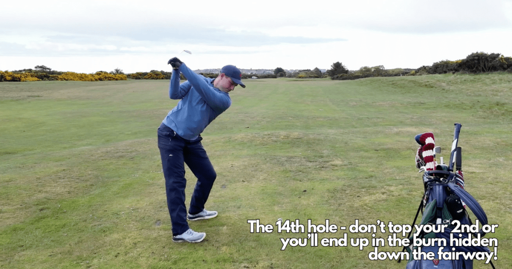 The 14th hole is very suitably named ‘Dinna Top.’ A good drive is required on this semi-blind hole where you hit towards a fairway sloping away from you and lined with gorse. The second shot is where the hole has been suitably named. A narrow and deep burn runs at an angle across the fairway, capturing any shots that may have been caught a little low on the face (or topped!). The visual intimidation on this course is a lot worse when you walk these holes than it is when you reach the greens and look back. The green at 14 looks surrounded by gorse however, once up at the green, there is a lot of space to the left and long meaning that this is really a hole to take advantage of.