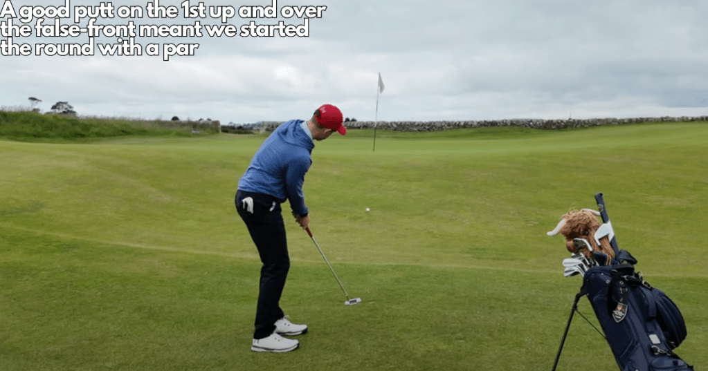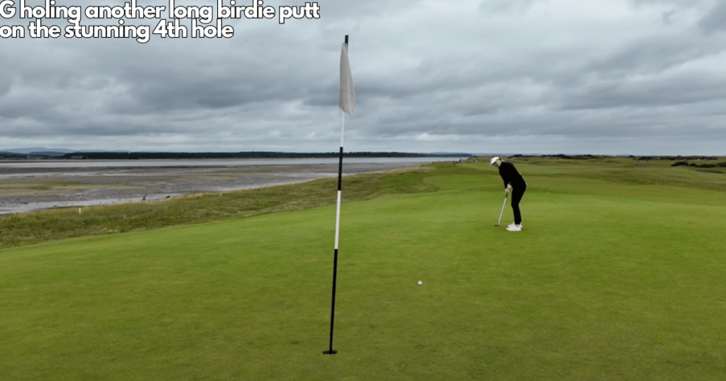 After a routine par on the 3rd, we reached the short par 4 4th hole. Despite being only 270 yards, it plays as one of the trickier tee-shots on the course since there is water right and gorse left. Cam hit his tee-shot slightly right of the green leaving an impossible chip, so we decided to go with G’s ball which was just short and to the left. Coming from the short left is the preferred angle for the approach as steep runoffs guard all other sides to the green. Cam failed to take advantage of the tee-shot by leaving his chip 20 feet from the hole. In the true fashion of golf, still riding the high of her last putt, G holed the putt to take us to -2 through 4 for our round.