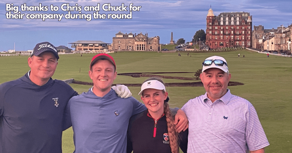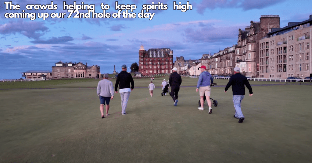 We made our way off the back of the 18th green on the Jubilee Course at the conclusion of our 3rd round and quickly walked to The Old Course which lies 500 yards or so away. As soon as we made it to the tee, our group was called up to play. Our playing partners for the day were Chuck and Chris who had travelled all the way from The USA and were in town on a bucket-list golf tour. We had played with Chris the previous evening and he had told us how Chuck, their group leader, was the only 1 of the 8 in the party who had not yet played The Old Course. So, we decided to invite Chuck and Chris back out for a game to help with our morale and tick the ultimate bucket-list course off for Chuck. They were also more than up to the task of being our cheerleaders for our final loop.