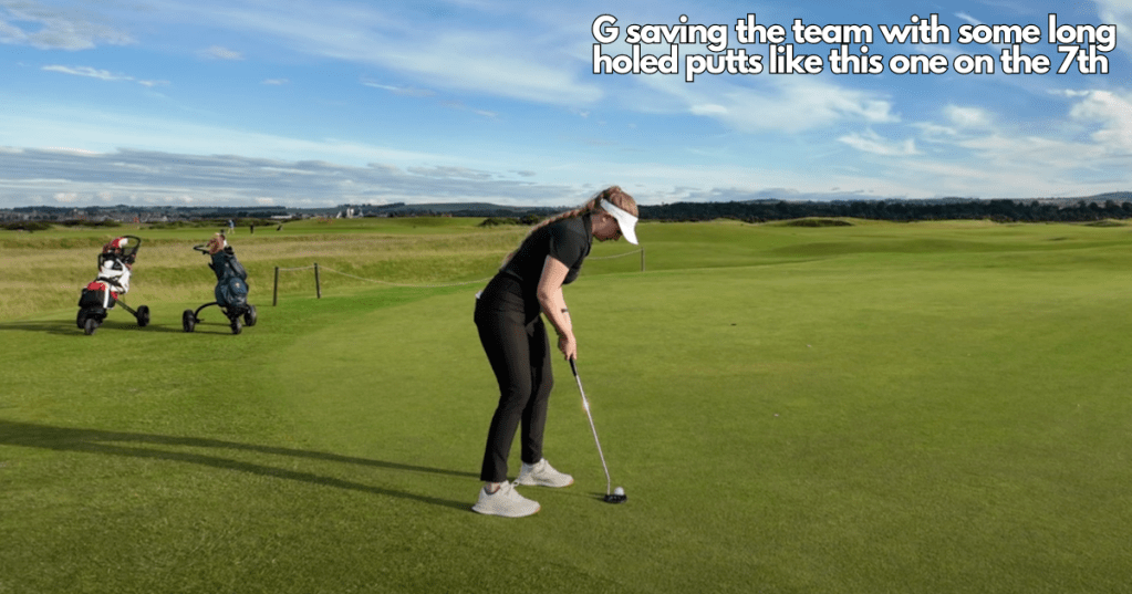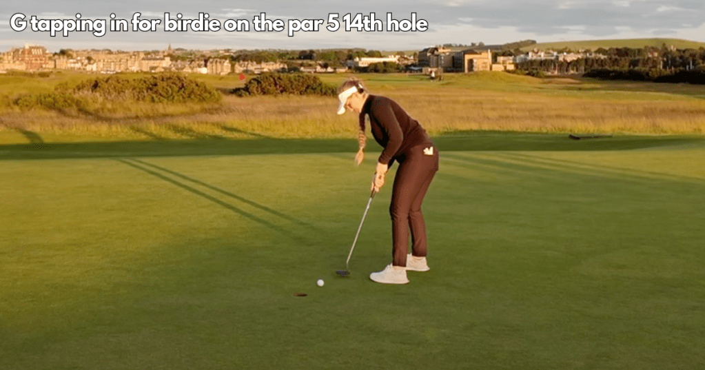 Our first tee shots left a lot to be desired and gave an indication as to the struggling energy levels that we were both playing on at the end of the day. G hit her tee-shot first and ended up bouncing down the road out of bounds to the right. With the pressure on, Cam chunked a 2-iron that thankfully chased down the fairway. An approach shot to the right of the green and 3 putts from there left us with a bogey to start and at -2 with 17 holes to play. A couple of other unfortunate bogeys at the 2nd and 4th holes left us with an uphill battle to the end of this round. However, we quickly managed to change the tide as G managed to hole a lengthy birdie putt on the 7th. We then followed this up with a solid birdie on the short par 4 9th to turn in 37 (+1). This left us -2 for the day.