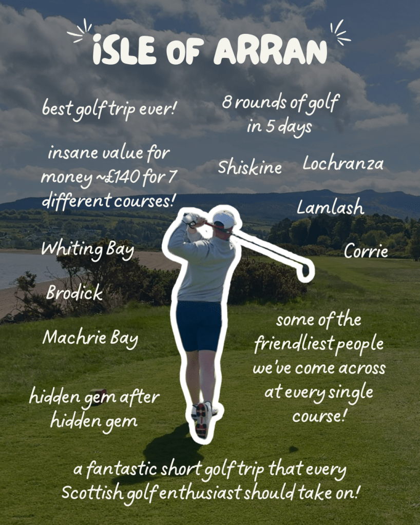 Ep24 | We’re Back!! – best golf trip EVER, comp recaps & handicap updates 👀 After a short time away from uploading we’re chatting you through our incredible trip to Arran, the reality of playing in amateur golf events, and how our handicaps are trending. We’ve wanted to do this trip to Arran for a very very long time. Arran features 7 different courses that you can tick off all in a few days, given it takes less than an hour to get from one side of the island to the other! Listen here 🎧